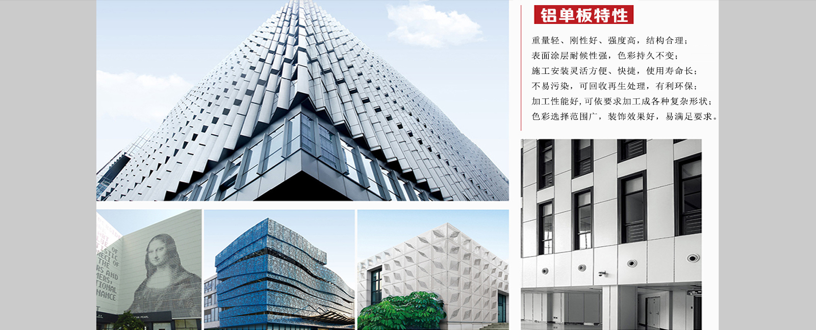 鋁單板工程案例可應用于:建筑物外墻、梁柱、門頭、陽臺、雨棚、廣告牌、室內建筑裝飾、商業(yè)大樓、別墅…